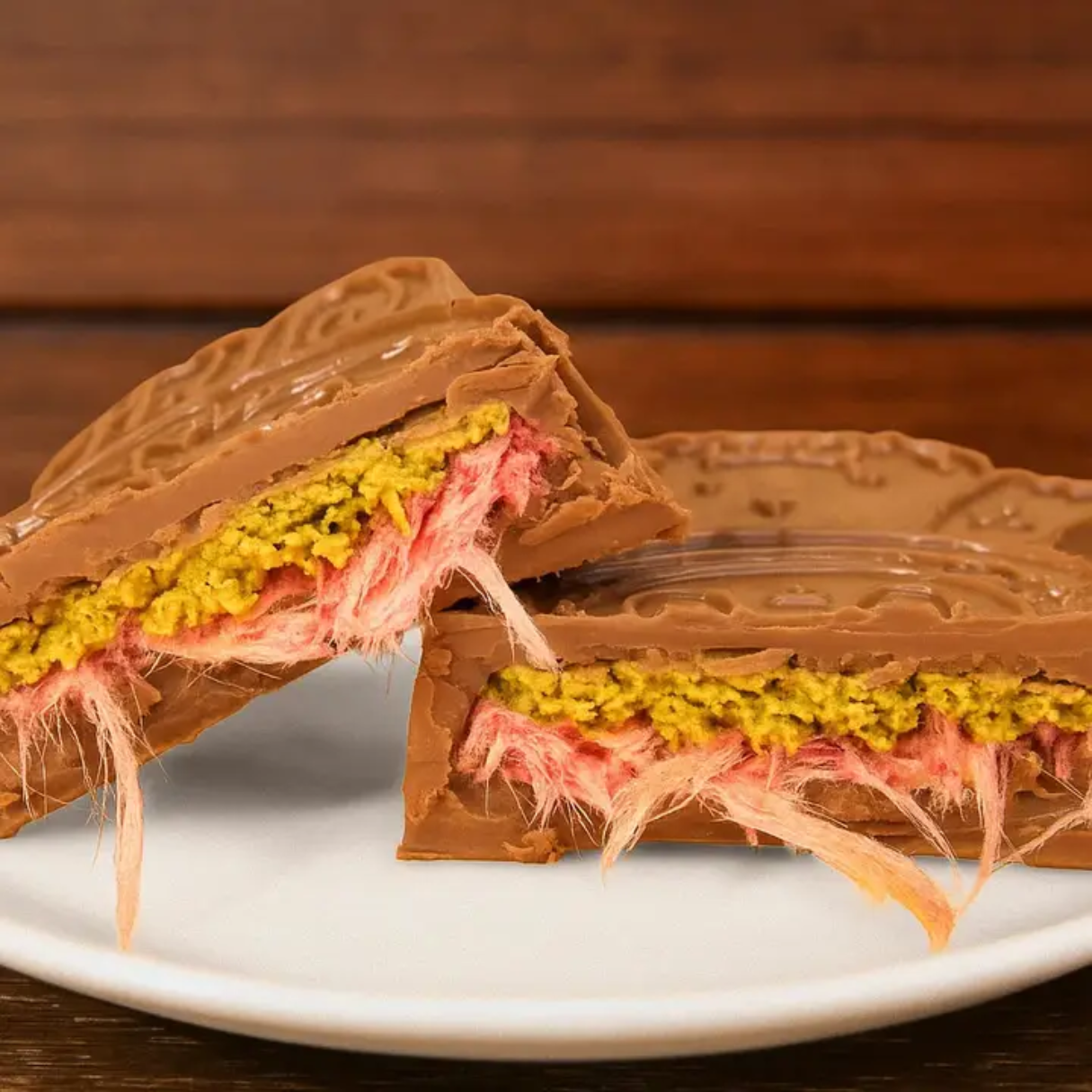 Indulge in a luxurious sweet escape with the Dubai Angel Hair Chocolate Bar in Pink Cotton Candy and Pistachio flavor. This unique 2.75 oz confection features delicate, airy strands of angel-hair-style chocolate infused with the playful sweetness of pink cotton candy and the rich, nutty crunch of pistachios. Crafted in Turkey, each bite blends silky chocolate with premium nuts for a texture and taste experience unlike any traditional chocolate bar. Perfect for gifting or treating yourself, this elegant chocolate delivers a whimsical twist on luxury sweets. Contains milk, peanuts, and soy.