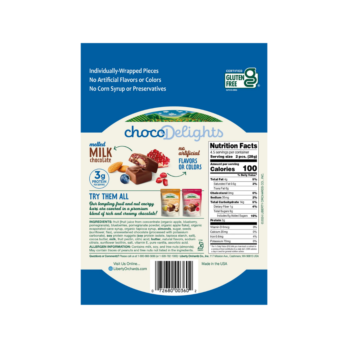 Indulge in the perfect blend of fruity, nutty, and chocolatey goodness with Liberty Orchards Choco Delights Blueberry Pomegranate & Almond. Each piece combines real blueberries and pomegranate with crunchy almonds, nutrient-packed flax and sunflower seeds, and crispy soy nuggets, all enrobed in smooth, rich chocolate. This 4.5oz peg bag is perfect for snacking, gifting, or sharing. With a delightful balance of textures and flavors, every bite is a satisfying treat for your taste buds. Available in a convenient 9-count case for stocking up or retail display.