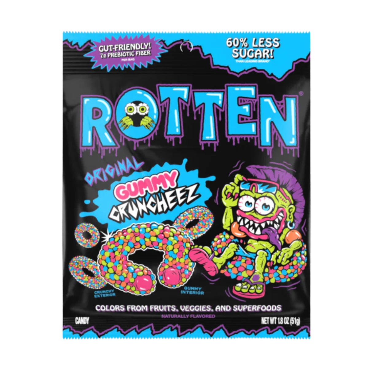 Snack smarter (and crunchier!) with Rotten Original Gummy Cruncheez—the guilt-free gummy candy with a delicious twist! These innovative treats feature a crunchy outer shell and a chewy gummy center for a texture combo that’s totally crave-worthy. Made with less sugar than traditional gummies and colored naturally with fruits, veggies, and superfoods, they’re as good for you as they are tasty. Plus, each bag packs in 7g of gut-friendly prebiotic fiber to keep things moving. Rotten never tasted so right!