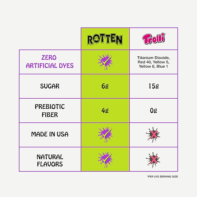 Say goodbye to ordinary gummies and hello to Rotten Sour Gummy Worms—the better-for-you candy that’s anything but basic! These tangy, chewy worms are made with less sugar than traditional gummy worms and get their vibrant colors from real fruits, veggies, and superfoods. Plus, each bag delivers a gut-friendly boost with 6g of prebiotic fiber to keep your sweet tooth and your stomach happy. Sour, chewy, colorful, and packed with goodness—these worms are rotten in name, but totally golden in every other way!