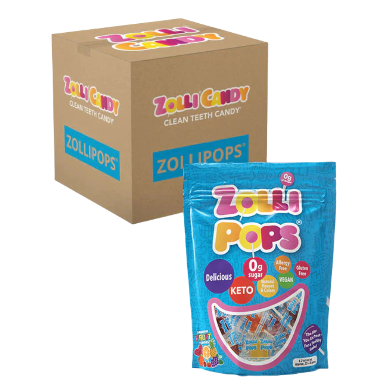 Zollipops Original Assorted Fruit lollipops deliver a guilt-free treat that’s as tasty as it is tooth-friendly. This 24-count case includes 5.2 oz pouches featuring six classic fruit flavors—Grape, Raspberry, Orange, Strawberry, Cherry, and Pineapple. Made with plant-based erythritol, stevia, and other smile-friendly ingredients, these pops help reduce acidity and promote a healthy mouth while satisfying your sweet tooth. Perfect for families, classrooms, or parties, Zollipops® are the “Clean Teeth Candy” everyone can enjoy.